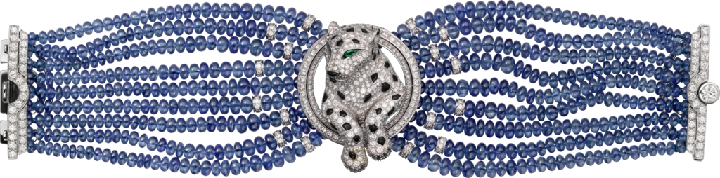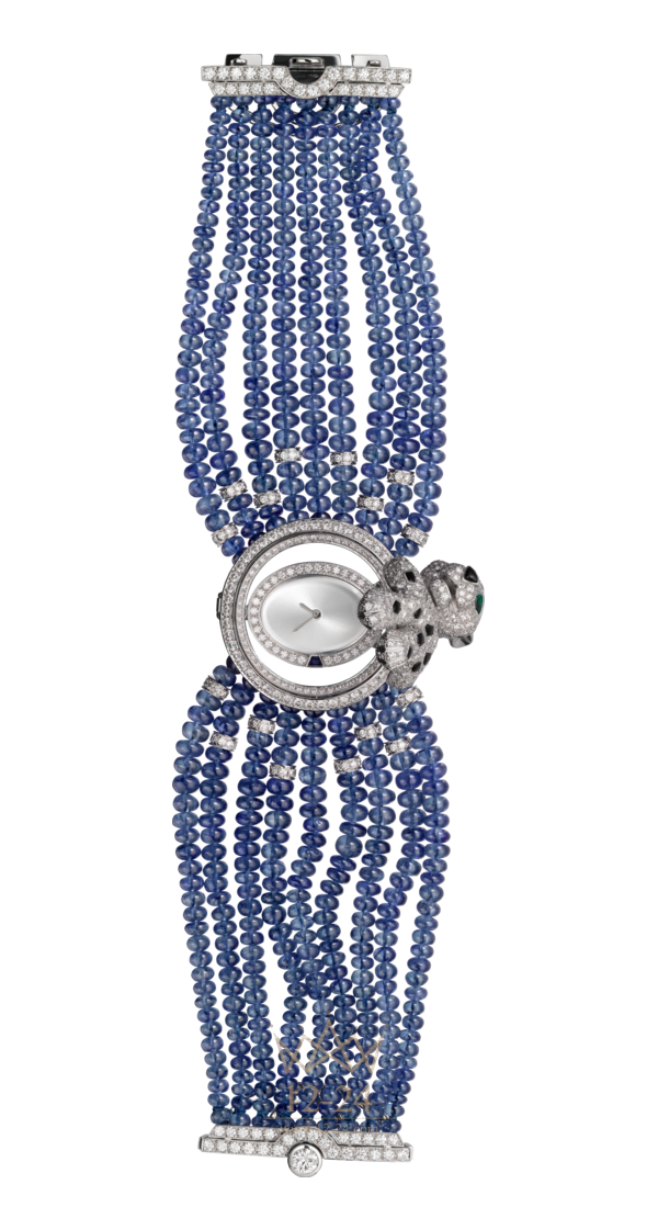 Часы со скрытым временем категории (HPI00542) Высокое ювелирное искусство, мотив «пантера», кварцевый механизм, калибр 056, корпус и браслет из белого золота 18 карат с родиевым покрытием, 474 бусины из сапфира общим весом 239,93 карата, 2 изумруда общим весом 0,11 карата, 32 пятна из оникса общим весом 3,07 карата, 811 бриллиантов общим весом 8,09 карата, посеребренный циферблат с узором «солнечные лучи» и покрытием из прозрачного лака, метка «12 часов» из сапфира весом 0,05 карата, стрелки в форме мечей из стали с родиевым покрытием, водонепроницаемость до 30 метров.