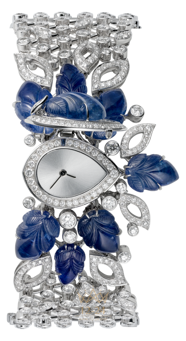 Часы со скрытым временем (HPI00547) категории Высокое ювелирное искусство, кварцевый механизм, калибр 058, корпус и браслет из белого золота 18 карат с родиевым покрытием украшены 414 бриллиантами общим весом 13,63 карата, 8 гравированными в виде листьев сапфирами общим весом 52,46 карата, посеребренный циферблат с узором «солнечные лучи» и покрытием из прозрачного лака, метка «12 часов» из сапфира весом 0,01 карата, стрелки в форме мечей из белого золота 18 карат с родиевым покрытием, водонепроницаемость до 30 метров. Единственный экземпляр.