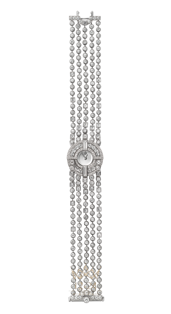 Часы с видимым временем (HPI00605) категории Высокое ювелирное искусство, кварцевый механизм, корпус и браслет из белого золота 18 карат с родиевым покрытием, 41 бриллиант багетной огранки общим весом 3,15 карата, 277 бриллиантов общим весом 9,16 карата, посеребренный циферблат с узором «солнечные лучи» и покрытием из прозрачного лака, метка «12 часов» из бриллианта, стрелки в форме мечей из белого золота 18 карат с родиевым покрытием, водонепроницаемость до 3 бар (30 метров), единственный экземпляр.