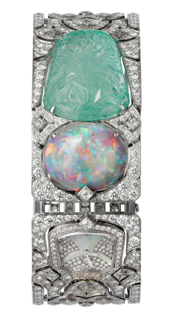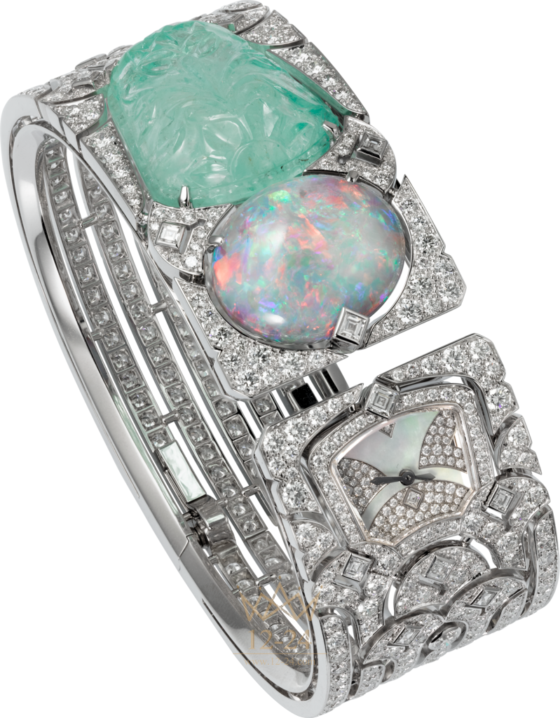 Часы с видимым временем (HPI00628) категории Высокое ювелирное искусство, кварцевый механизм, калибр 056, корпус и браслет из белого золота 18 карат с родиевым покрытием, 1 опал огранки кабошон весом 12,93 карата, 1 резной изумруд весом 28,77 карата, 542 бриллианта общим весом 13,29 карата, 14 бриллиантов багетной огранки общим весом 0,56 карата.