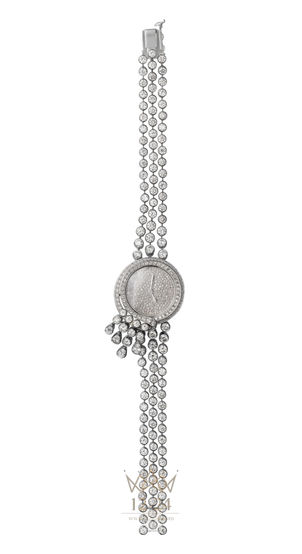 Часы с видимым временем (HPI00629) категории Высокое ювелирное искусство, кварцевый механизм, калибр 056, циферблат, корпус и браслет из белого золота 18 карат с родиевым покрытием, 4 бриллианта огранки «груша» общим весом 0,53 карата, 481 бриллиант классической огранки общим весом 9,98 карата, стрелки в форме мечей из стали с родиевым покрытием, водонепроницаемость до 3 бар (около 30 метров). Размер запястья 170 мм.