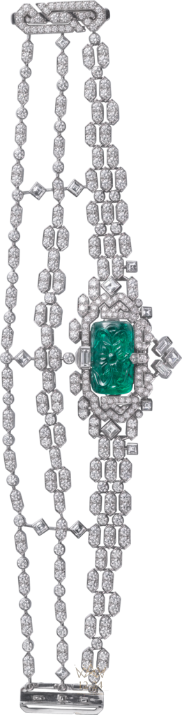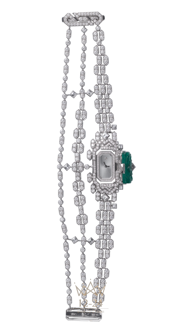 Часы со скрытым временем (HPI00632) категории Высокое ювелирное искусство, кварцевый механизм, калибр 058, корпус и браслет из белого золота 18 карат с родиевым покрытием, 1 резной изумруд весом 8,47 карата, 3 бриллианта багетной огранки общим весом 0,5 карата, 14 квадратных бриллиантов общим весом 1,51 карата, 392 бриллианта общим весом 11,53 карата.