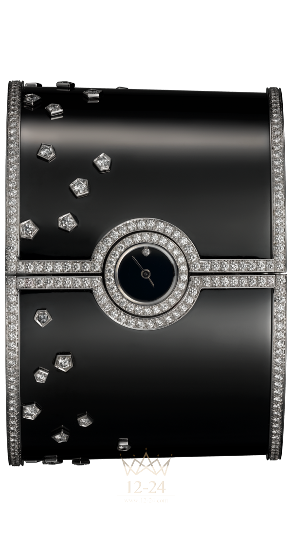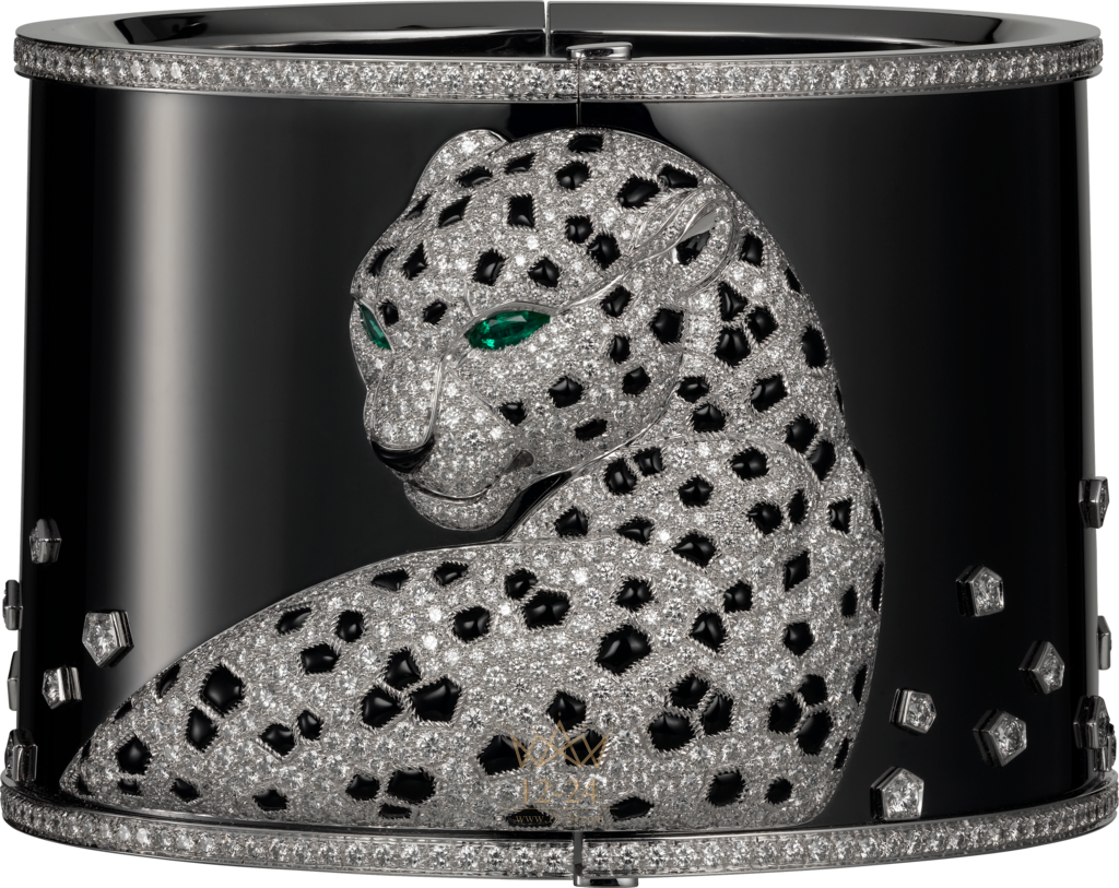Часы категории Высокое ювелирное искусство (HPI00645) с видимым временем, мотив «пантера», кварцевый механизм, корпус и браслет из белого золота 18 карат с родиевым и ADLC-покрытием украшены 937 бриллиантами общим весом 9,67 карата, 2 изумруда овальной огранки общим весом 0,19 карата (глаза), оникс общим весом 2,74 карата (нос и пятна).