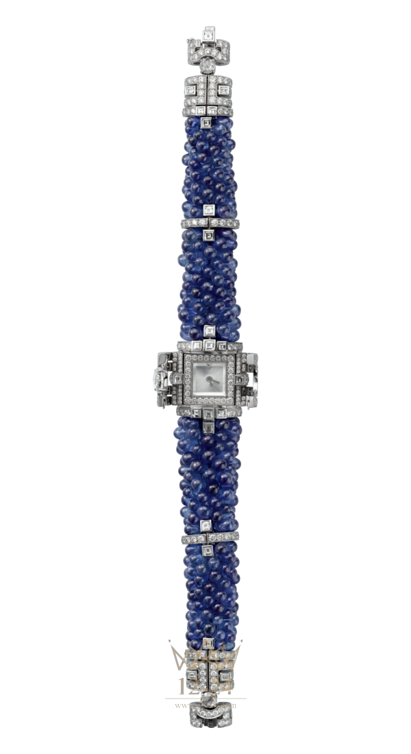 Часы со скрытым временем (HPI00663) категории Высокое ювелирное искусство, кварцевый механизм, калибр 058, корпус и браслет из белого золота 18 карат с родиевым покрытием, 1 бриллиант огранки «роза» весом 1,03 карата, 2 бриллианта огранки «роза» общим весом 0,55 карата, 352 сапфира огранки «капля» общим весом 156,81 карата, 27 квадратных бриллиантов общим весом 1,39 карата, 350 бриллианта общим весом 4,01 карата.