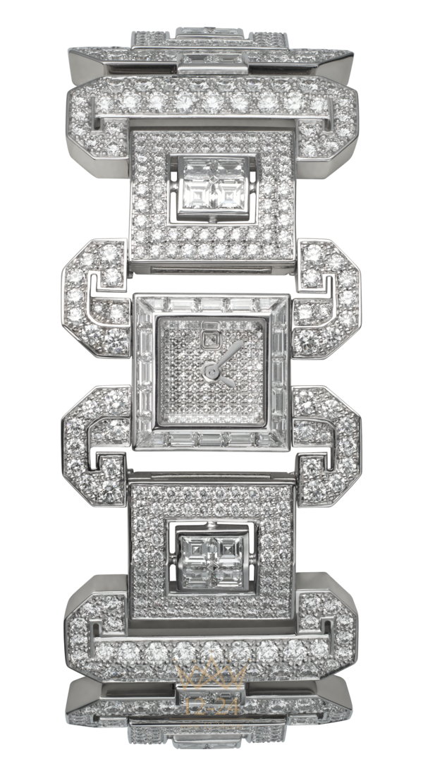 Часы с видимым временем категории (HPI00675) Высокое ювелирное искусство, кварцевый механизм, калибр 058, корпус из белого золота 18 карат с родиевым покрытием украшен 20 бриллиантами багетной огранки общим весом 0,66 карата, браслет из белого золота 18 карат с родиевым покрытием украшен 34 бриллиантами багетной огранки общим весом 2,82 карата и 734 бриллиантами общим весом 11,35 карата.