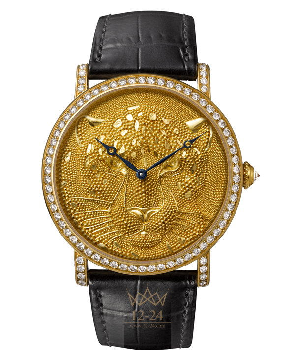 Корпус из желтого золота 18 карат с бриллиантами классической огранки, заводная головка с отделкой бусинами и бриллиантом классической огранки, сапфировое стекло, циферблат из желтого золота 22 карата, мотив “пантера” из желтого золота 22 карата в технике зернения, брегетные стрелки из вороненой стали. Полуматовый ремешок из кожи аллигатора черного цвета, украшенная бриллиантами двойная регулируемая раскладывающаяся застежка из желтого золота 18 карат, длина застежки 18 мм. Мануфактурный механизм с ручным заводом, калибр 9601 MC, задняя крышка из сапфирового стекла, водонепроницаемость до 3 бар (30 метров).