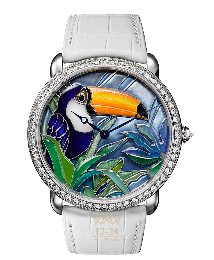 Часы Cartier d'Art, модель XL, механизм с ручным заводом, калибр 430 MC. Корпус из белого золота 18 карат с родиевым покрытием украшен 60 бриллиантами классической огранки, заводная головка с зернистой отделкой и граненым бриллиантом классической огранки, общий вес бриллиантов: 1,57 карата. Циферблат из белого золота 18 карат, перегородчатая эмаль, миниатюрная картина на перламутре, мотив “тукан”. Брегетные стрелки из вороненой стали. Сапфировое стекло. Ремешок из полуматовой кожи аллигатора белого цвета, двойная регулируемая раскладывающаяся застежка 18 мм из белого золота 18 карат с родиевым покрытием украшена 43 бриллиантами классической огранки общим весом 0,42 карата. Высота корпуса: 8,5 мм. Водонепроницаемость до 30 метров. Ограниченная пронумерованная серия из 40 экземпляров.