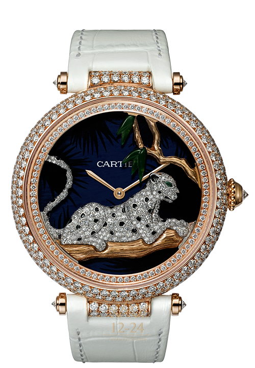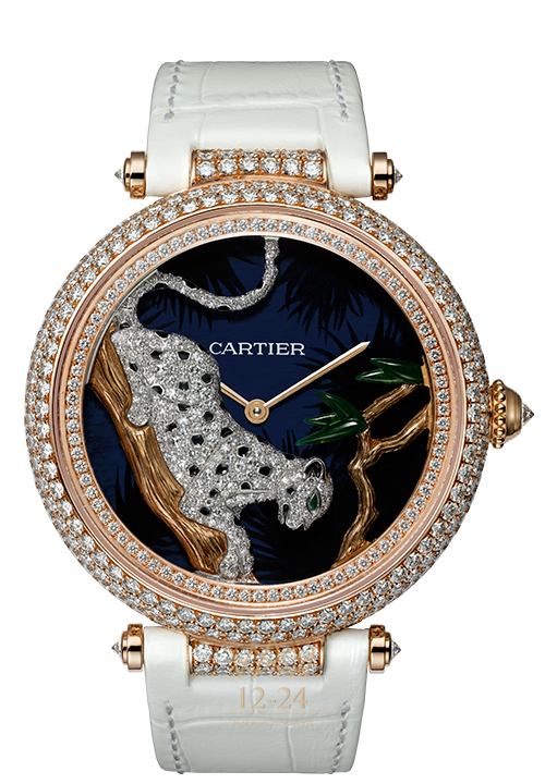 На циферблате среди богатой растительности джунглей располагается драгоценная пантера из бриллиантов. Дикая кошка, соединенная невидимым механизмом с часовым калибром 9603 MC с автоматическим подзаводом, движется в такт времени в лучших традициях часового искусства Cartier.