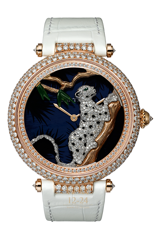 Часы Panthère au Clair de Lune de Cartier, 42,75 мм, механизм с автоматическим подзаводом, калибр 9603 MC. Корпус из розового золота 18 карат украшен 395 бриллиантами классической огранки, заводная головка с зернистой отделкой и граненым бриллиантом классической огранки, общий вес бриллиантов: 5,85 карата. Циферблат из белого золота, декоративный элемент в виде миниатюрной картины. Стрелки в форме мечей из стали с отделкой золотом. Сапфировое стекло. Ремешок из кожи аллигатора белого цвета, двойная регулируемая раскладывающаяся застежка из розового золота 18 карат украшена 43 бриллиантами классической огранки общим весом 0,42 карата. Ротор, мотив “пантера” из белого золота 18 карат, 190 бриллиантов классической огранки общим весом 0,37 карата, черный лак (пятна), розовое золото, зеленая яшма. Индивидуально пронумерованный механизм, 204 детали, 31 камень. Диаметр механизма: 36,18 мм (16 линий), высота: 6,85 мм, частота баланса: 28 800 полу-колебаний/час, запас хода: около 48 часов. Задняя крышка из сапфирового стекла. Высота корпуса: 11,4 мм. Водонепроницаемость до 3 бар (30 метров). Пронумерованная серия.