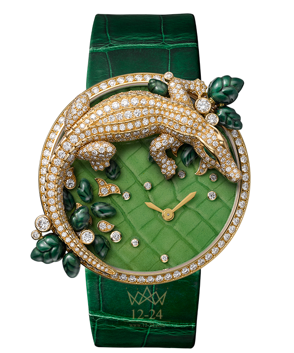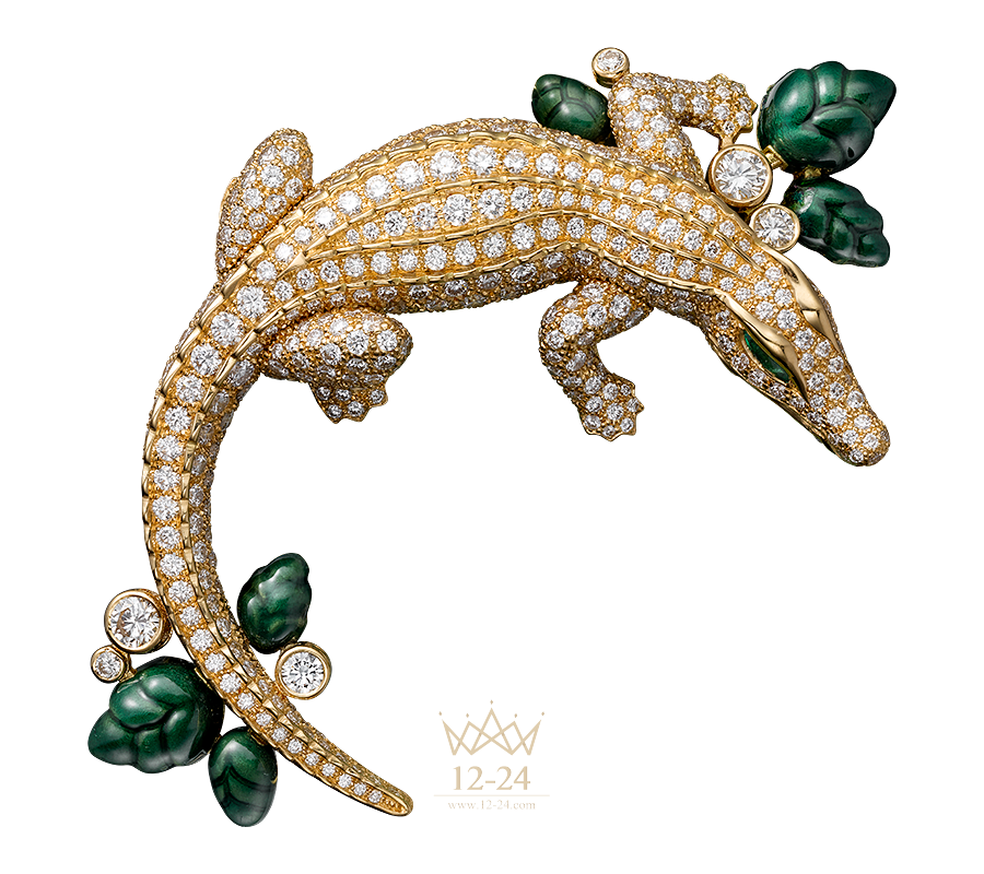 Часы и брошь Les Indomptables de Cartier с мотивом “крокодил”, кварцевый механизм, корпус из желтого золота 18 карат украшен 214 бриллиантами классической огранки общим весом 2,69 карата, брошь с мотивом “крокодил” из желтого золота 18 карат украшена 541 бриллиантом классической огранки общим весом 3,02 карата, 2 изумруда (глаза), гравировка, эмаль (листья), циферблат с мотивом чешуи из белого золота 18 карат с родиевым покрытием украшен 41 бриллиантом классической огранки общим весом 0,27 карата, гравировка, эмаль (листья), стрелки в форме мечей из стали с отделкой золотом, ремешок из блестящей кожи аллигатора зеленого цвета, двойная регулируемая раскладывающаяся застежка 18 мм из желтого золота 18 карат украшена 43 бриллиантами общим весом 0,42 карата, водонепроницаемость до 30 метров, ограниченная пронумерованная серия из 50 экземпляров.