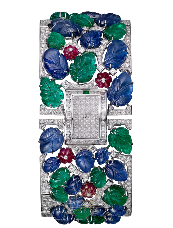Часы с видимым временем категории Высокое ювелирное искусство, кварцевый механизм, корпус и браслет из белого золота 18 карат с родиевым покрытием, 29 резных сапфиров в форме листьев общим весом 64,21 карата, 23 резных изумруда в форме листьев общим весом 32,39 карата, 9 бусин из рубина рельефной огранки общим весом 7,48 карата, 56 бриллиантов квадратной огранки общим весом 1,8 карата, 667 бриллиантов классической огранки общим весом 7,52 карата, циферблат из белого золота 18 карат с родиевым покрытием, 156 бриллиантов классической огранки общим весом 0,24 карата, метка “12 часов” из изумруда прямоугольной огранки общим весом 0,02 карата, стрелки в форме мечей из белого золота 18 карат с родиевым покрытием, водонепроницаемость до 3 бар (30 метров), единственный экземпляр.