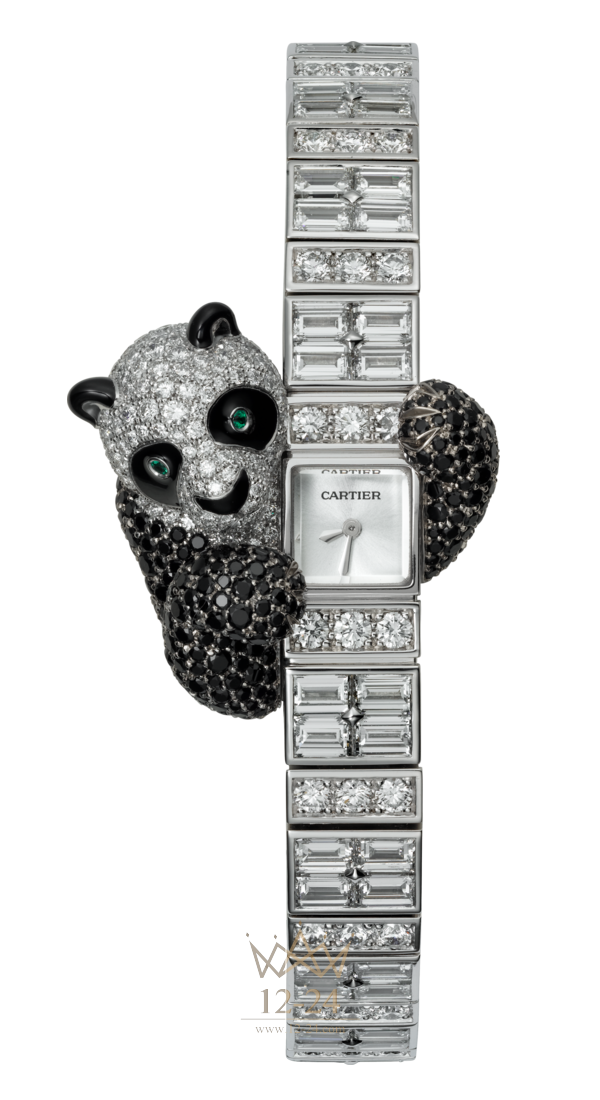 Часы с видимым временем (HPI00746) категории Высокое ювелирное искусство, мотив «панда», механизм с ручным заводом, калибр 101, корпус и браслет из белого золота 18 карат с родиевым покрытием и белого золота 18 карат, 68 бриллиантов багетной огранки общим весом 8,48 карата, 247 бриллиантов классической огранки общим весом 3,12 карата, 263 черных сапфира, изумруды (глаза), черная эмаль, посеребренный циферблат с узором «солнечные лучи» и покрытием из прозрачного лака, стрелки в форме мечей из стали с родиевым покрытием. Размер запястья: 165 мм.