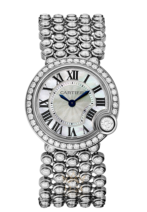 В коллекции Ballon de Cartier представлены драгоценные женские модели часов, сочетающие в себе лучшие традиции Дома и новый дизайн. Пять рядов изящных бусин, украшенных в технике паве или с гладкой поверхностью, создают впечатление, будто гильошированный в технике flinqué циферблат из перламутра парит в воздухе. Изысканность циферблата подчеркивается сиянием уникального бриллианта, украшающего его изгибы. Эти невесомые и грациозные часы воплощают непревзойденное ювелирное и часовое мастерство Дома.