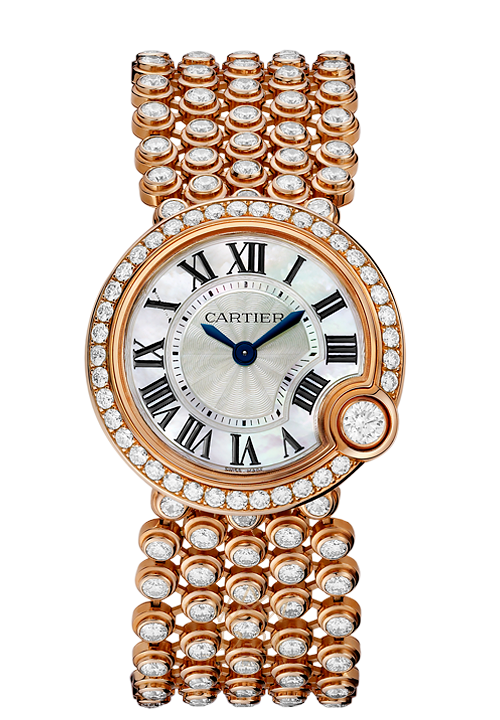 В коллекции Ballon de Cartier представлены драгоценные женские модели часов, сочетающие в себе лучшие традиции Дома и новый дизайн. Пять рядов изящных бусин, украшенных в технике паве или с гладкой поверхностью, создают впечатление, будто гильошированный в технике flinqué циферблат из перламутра парит в воздухе. Изысканность циферблата подчеркивается сиянием уникального бриллианта, украшающего его изгибы. Эти невесомые и грациозные часы воплощают непревзойденное ювелирное и часовое мастерство Дома.
