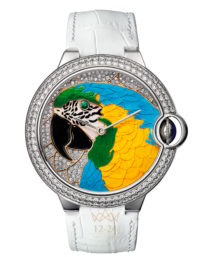 Часы Cartier d'Art, 42 мм, механизм с автоматическим подзаводом. Корпус из белого золота 18 карат с родиевым покрытием, рифленая заводная головка украшена сапфиром в форме кабошона. Циферблат из белого золота 18 карат с родиевым покрытием и розового золота 18 карат украшен цветочной мозаикой “маркетри”, 110 бриллиантами общим весом 0,33 карата и изумрудом, мотив “попугай”. Стрелки в форме мечей из полированной стали. Сапфировое стекло. Ремешок из полуматовой кожи аллигатора белого цвета, двойная регулируемая раскладывающаяся застежка 18 мм из белого золота 18 карат с родиевым покрытием украшена 43 бриллиантами общим весом 0,42 карата. Высота корпуса: 14,35 мм. Водонепроницаемость до 30 метров. Ограниченная пронумерованная серия из 20 экземпляров.