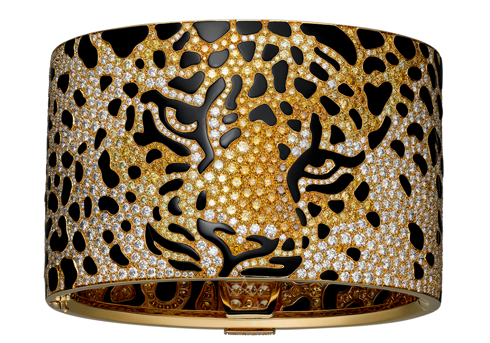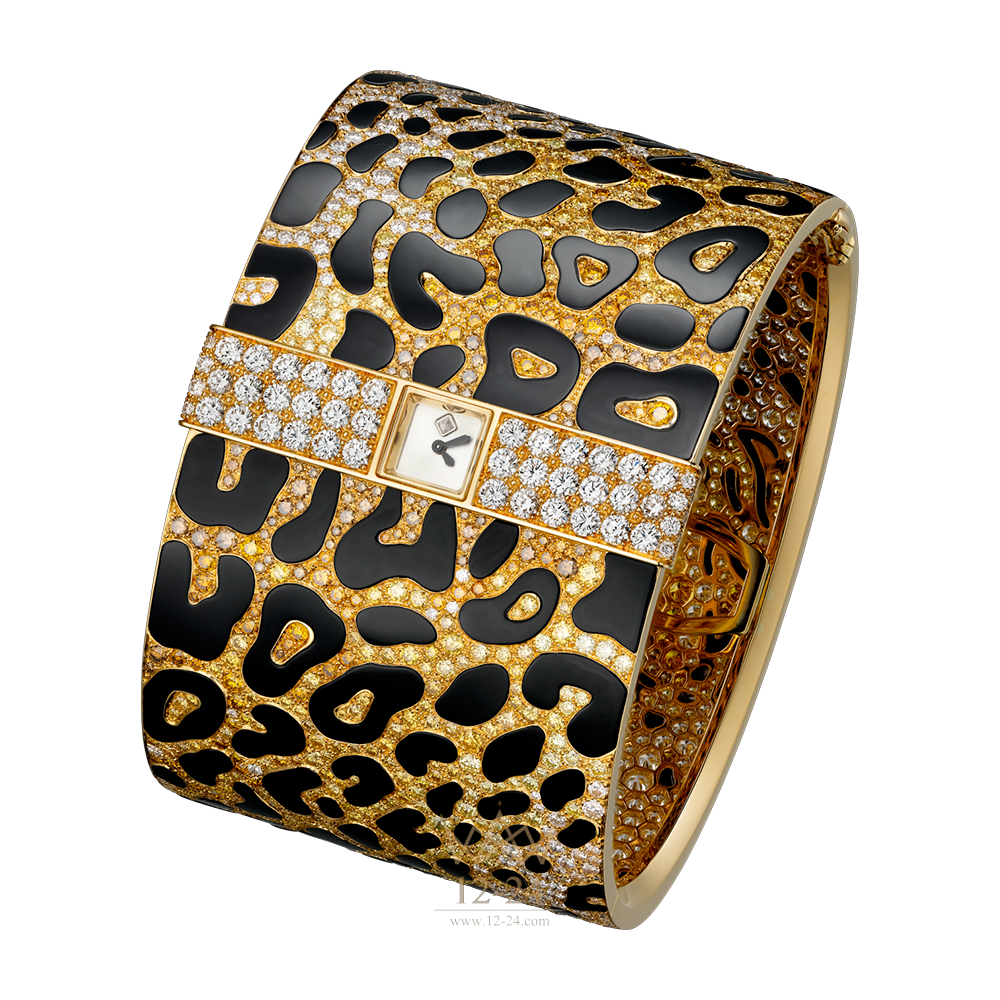 Часы с видимым временем Panthère Impériale категории Высокое ювелирное искусство, механизм с ручным заводом, калибр 101 MC, корпус и браслет из желтого золота 18 карат с 278 бриллиантами классической огранки нежного оранжевого цвета общим весом 3,74 карата, 255 оранжевых бриллиантов классической огранки общим весом 3,15 карата, 211 бриллиантов классической огранки нежного желтого цвета общим весом 2,49 карата, 69 коричневых бриллиантов классической огранки общим весом 0,71 карата, 868 бриллиантов классической огранки общим весом 12,77 карата, 220 ониксов общим весом 26,01 карата, посеребренный циферблат с узором “солнечные лучи” и покрытием из прозрачного лака, метка “12 часов” из бриллианта квадратной огранки, стрелки в форме мечей из стали с родиевым покрытием, единственный экземпляр.