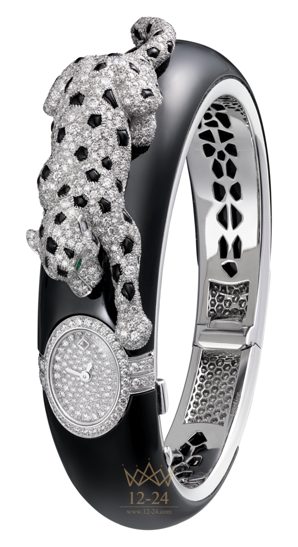 Часы с видимым временем Panthère de Cartier (HPI00786) категории Высокое ювелирное искусство, кварцевый механизм, корпус и браслет из черного нефрита 148,66 карата и белого золота 18 карат украшены 840 бриллиантами классической огранки общим весом 5,97 карата, 65 ониксами общим весом 2,05 карата, 2 изумрудами огранки «груша» общим весом 0,04 карата (глаза).