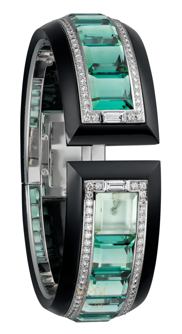 Часы с видимым временем (HPI00893) категории Высокое ювелирное искусство, кварцевый механизм, корпус и браслет из белого золота 18 карат с родиевым покрытием, оникс, 14 зеленых турмалинов огранки «изумруд», 2 бриллианта багетной огранки общим весом 0,29 карата, 228 бриллиантов классической огранки общим весом 2,24 карата, посеребренный циферблат с узором «солнечные лучи» и покрытием из прозрачного лака, стрелки в форме мечей из белого золота 18 карат с родиевым покрытием, водонепроницаемость до 3 бар (30 метров), единственный экземпляр.