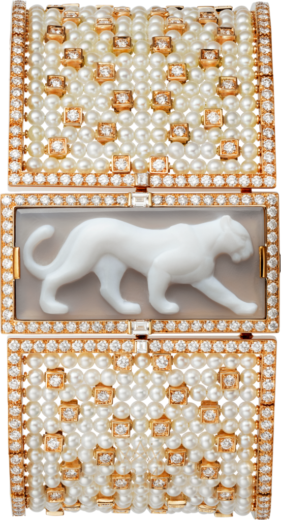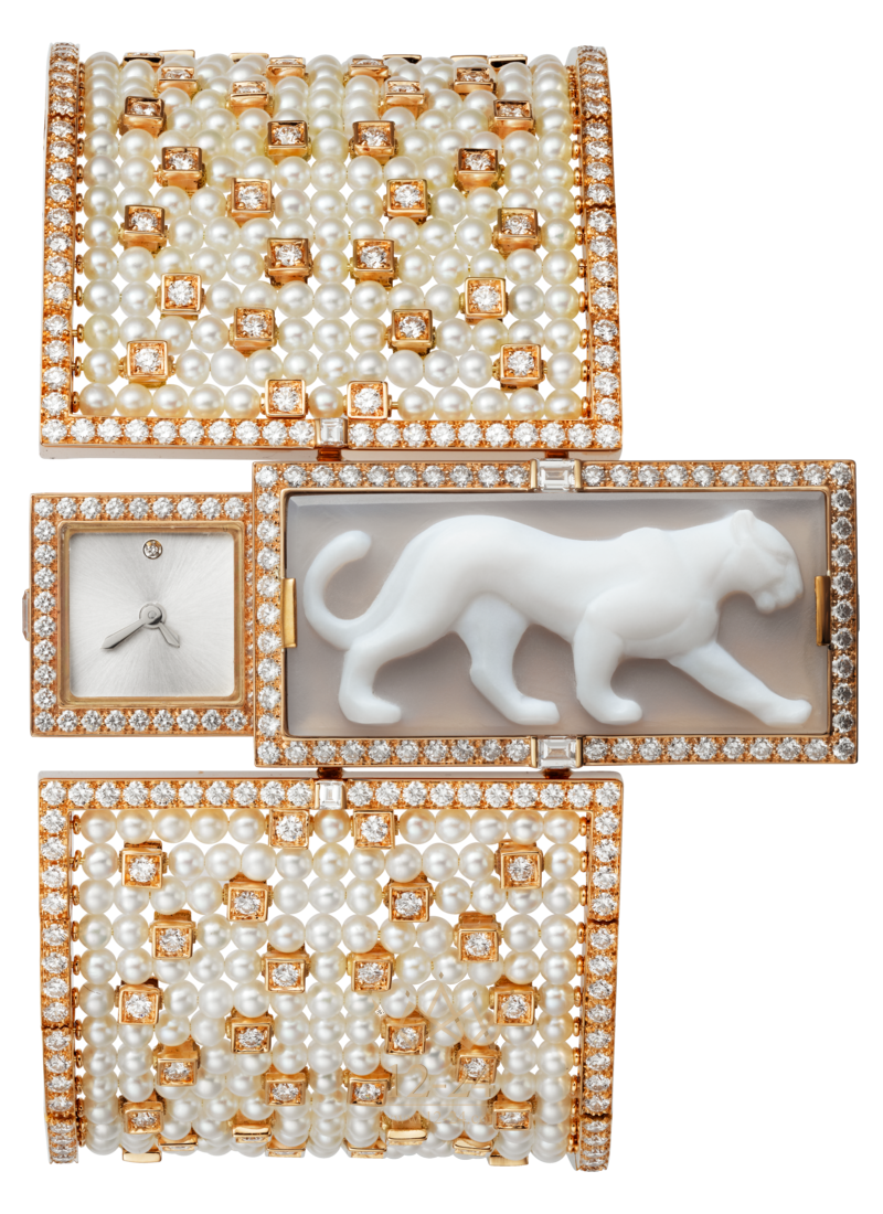 Часы с секретом (HPI00896) Panthère категории Высокое ювелирное искусство, кварцевый механизм, корпус и браслет из розового золота 18 карат, камея из агата весом 14,03 карата, 571 бриллиант классической огранки общим весом 6,74 карата, 6 бриллиантов багетной огранки общим весом 0,33 карата, 704 речных жемчужины общим весом 104,29 карата.