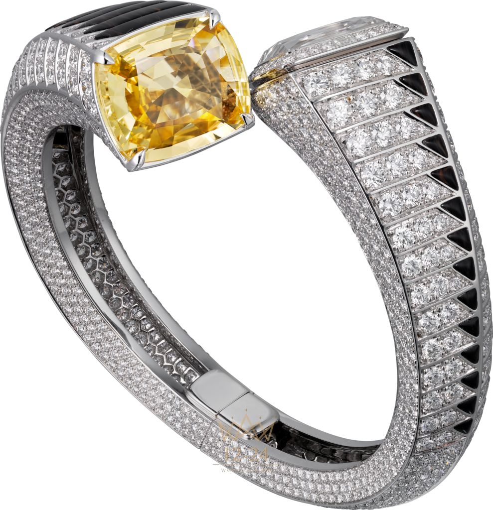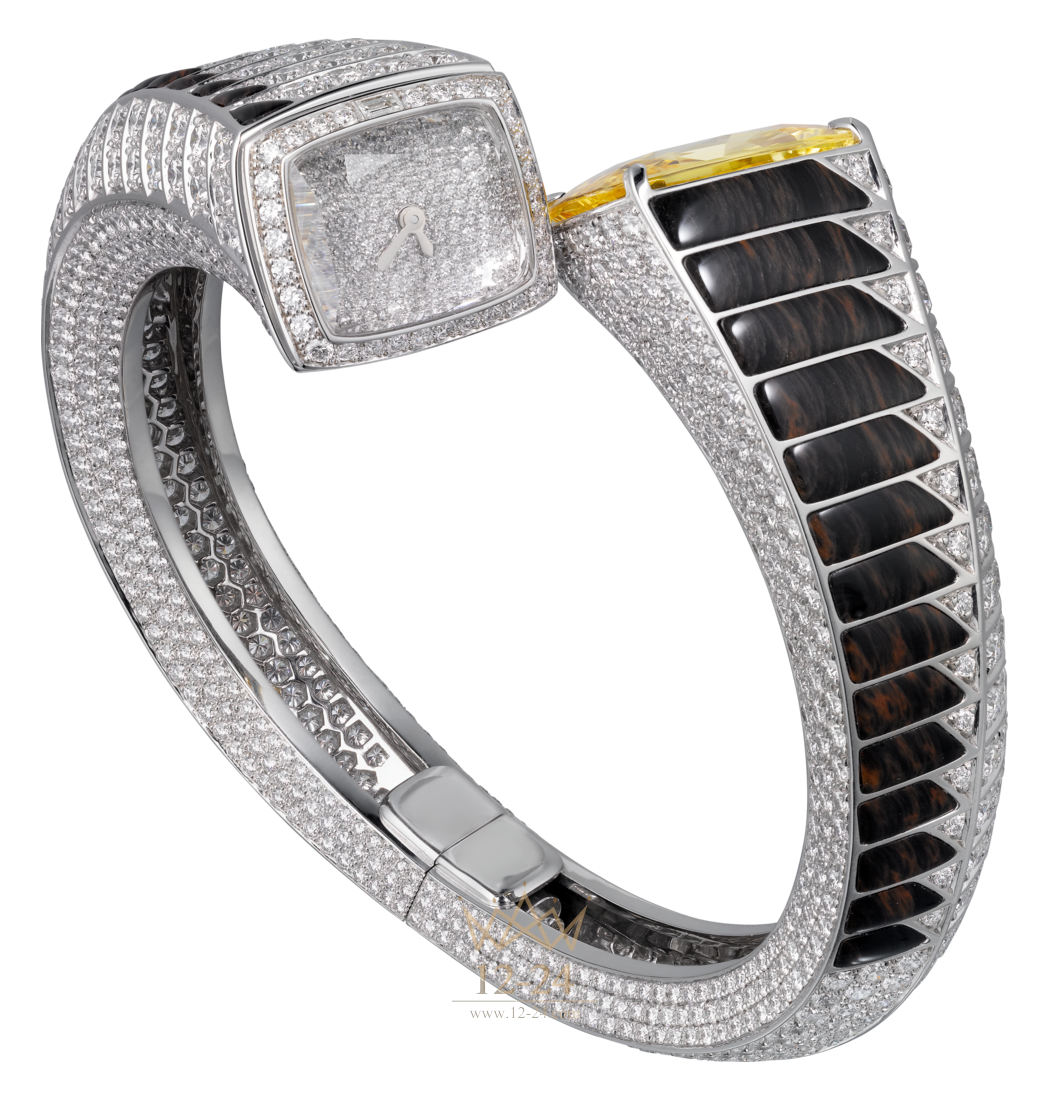 Часы Totem (HPI00909) категории Высокое ювелирное искусство с видимым временем, кварцевый механизм, корпус и браслет из белого золота 18 карат с родиевым покрытием украшены желтым сапфиром огранки «подушка» весом 16,26 карата, бриллиантом багетной огранки весом 0,04 карата, 1 192 бриллиантами классической огранки общим весом 21,67 карата, 28 обсидианами общим весом 5,33 карата.