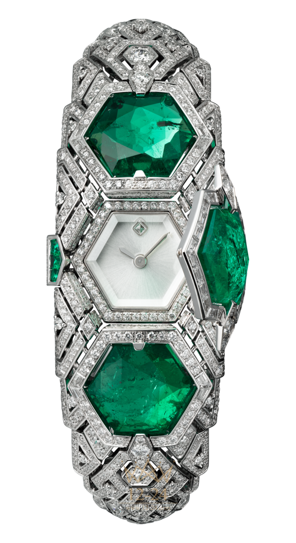 Часы со скрытым временем (HPI00910) категории Высокое ювелирное искусство, кварцевый механизм, корпус и браслет из белого золота 18 карат с родиевым покрытием украшены 3 шестиугольными изумрудами общим весом 16,21 карата, 32 бриллиантами багетной огранки общим весом 1,03 карата, 819 бриллиантами классической огранки общим весом 7,96 карата, 6 изумрудами багетной огранки общим весом 0,34 карата.