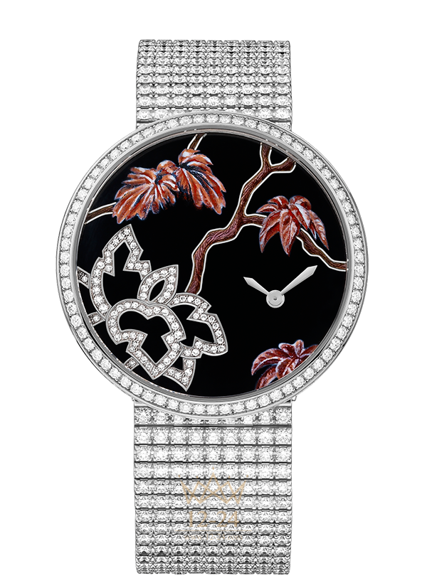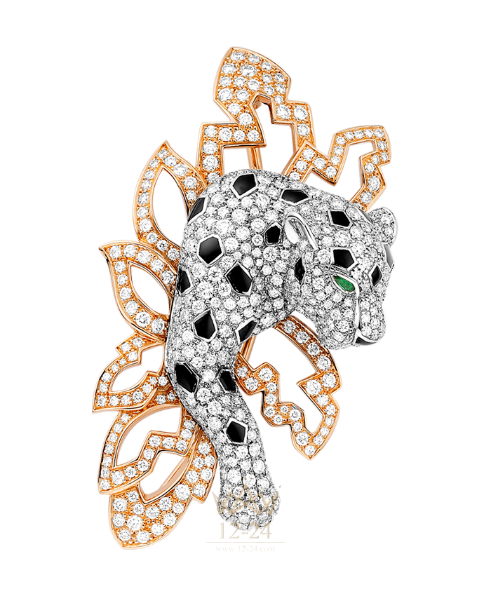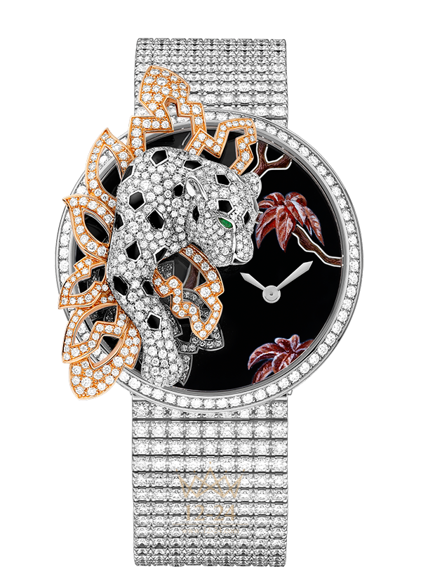 Часы-брошь Les Indomptables de Cartier, мотив “пантера”, кварцевый механизм, корпус из белого золота 18 карат с родиевым покрытием украшен 212 бриллиантами классической огранки общим весом 2,67 карата, брошь с мотивом “пантера” из белого золота 18 карат с родиевым покрытием, листва из розового золота 18 карат, 472 бриллианта классической огранки общим весом 2,08 карата, изумруды грушевидной огранки (глаза), черная эмаль (нос, пятна и уши), циферблат из белого золота 18 карат с родиевым покрытием украшен 85 бриллиантами общим весом 0,21 карата, черная эмаль, нанесенная эмалью миниатюрная картина (листва и ветви), стрелки в форме мечей из стали с родиевым покрытием, браслет из белого золота 18 карат с родиевым покрытием украшен 594 бриллиантами общим весом 16,73 карата, водонепроницаемость до 3 бар (30 метров), ограниченная пронумерованная серия из 5 экземпляров.