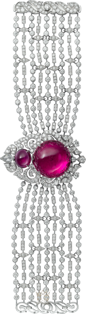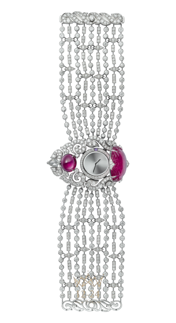 Часы со скрытым временем (HPI00928) категории Высокое ювелирное искусство, кварцевый механизм, корпус и браслет из белого золота 18 карат с родиевым покрытием, 1 гравированный рубеллит в форме кабошона весом 46,65 карата, 1 грушевидный бриллиант огранки «роза» весом 0,78 карата, 478 бриллиантов общим весом 26,27 карата, метка «12 часов» из розового сапфира, посеребренный циферблат с узором «солнечные лучи» и покрытием из прозрачного лака, стрелки в форме мечей из золота 18 карат с родиевым покрытием, водонепроницаемость до 3 бар (30 метров), единственный экземпляр.