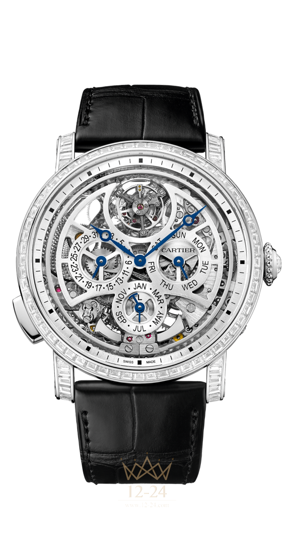 Часы Rotonde de Cartier Grande Complication (HPI00939), модель скелетон, 45 мм, механизм с автоматическим подзаводом, калибр 9406 MC отмечен «Poinçon de Genève». Корпус из платины 950 пробы, 84 бриллианта багетной огранки общим весом 3,41 карата, заводная головка из платины 950 пробы с зернистой отделкой и граненым бриллиантом весом 0,2 карата, циферблат из латуни с узором «солнечные лучи», брегетные стрелки, стрелки в форме палочек или молоточков из вороненой стали.