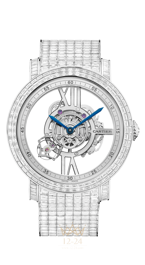 Часы Rotonde de Cartier Astrotourbillon (HPI00941), модель скелетон, 48 мм, механизм с ручным заводом, калибр 9461 MC. Корпус из платины 950 пробы украшен 283 бриллиантами багетной огранки общим весом 13,28 карата, заводная головка из платины 950 пробы с зернистой отделкой и бриллиантом классической огранки весом 0,2 карата, циферблат с римскими цифрами образован мостами механизма, стрелки в форме мечей из вороненой стали.