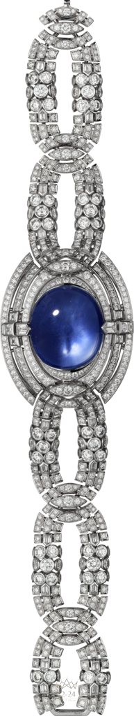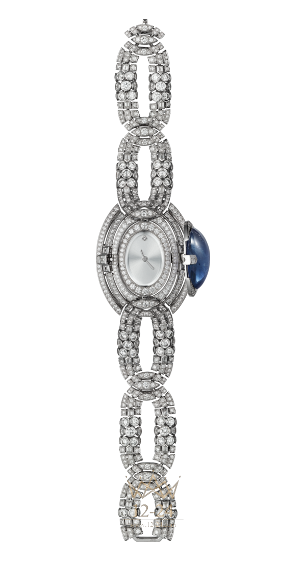 Часы со скрытым временем (HPI00948) категории Высокое ювелирное искусство, кварцевый механизм, корпус и браслет из белого золота 18 карат с родиевым покрытием, 1 цейлонский сапфир в форме кабошона весом 25,17 карата, 28 бриллиантов багетной огранки общим весом 31,49 карата, 768 бриллиантов классической огранки общим весом 14,72 карата.