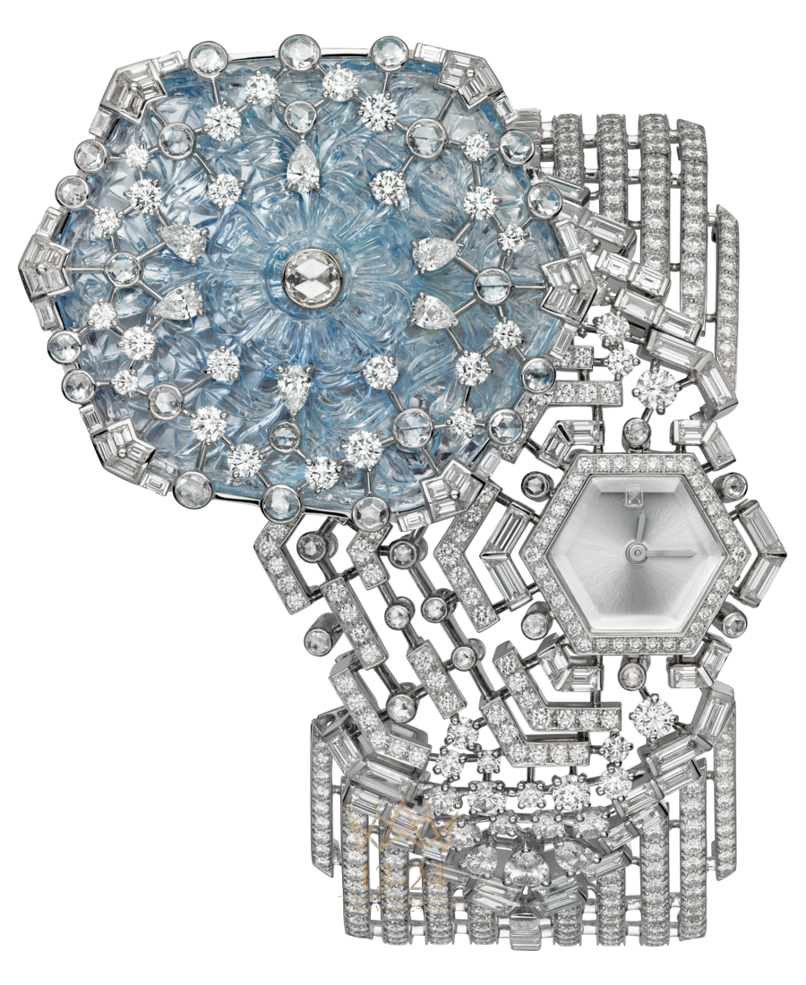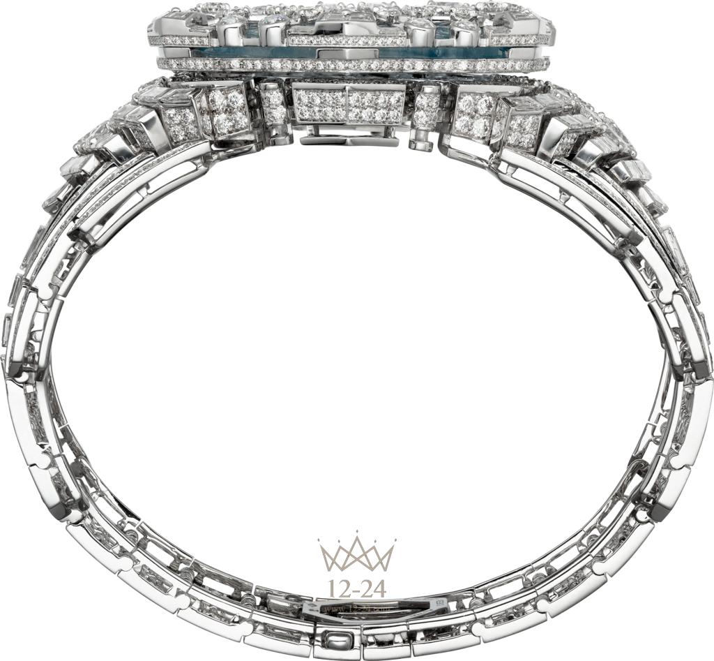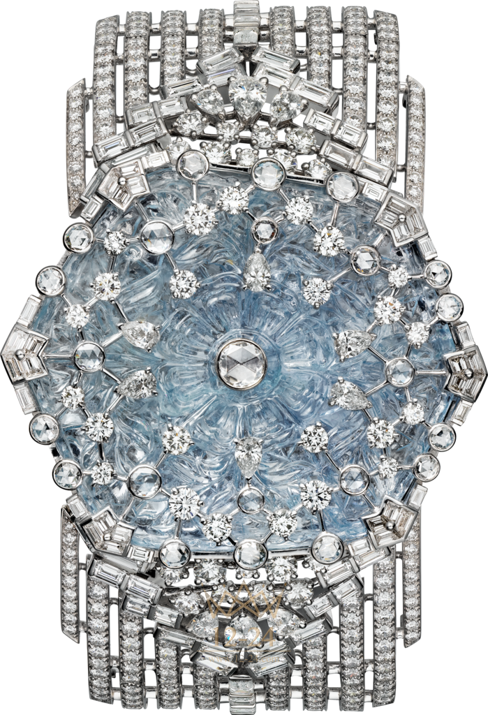 Часы с секретом (HPI00951) категории Высокое ювелирное искусство, кварцевый механизм, корпус и браслет из белого золота 18 карат с родиевым покрытием, 1 гравированный сапфир весом 51,55 карата, 12 бриллиантов огранки «груша» общим весом 1,33 карата, 94 бриллианта багетной огранки общим весом 5,54 карата, 41 бриллиант огранки «роза» общим весом 1,71 карата и 844 бриллианта классической огранки общим весом 12,84 карата.