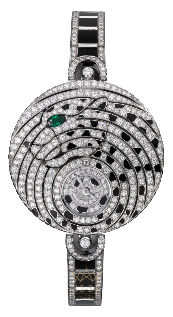 Часы с видимым временем (HPI00956) категории Высокое ювелирное искусство, кварцевый механизм, корпус и браслет из белого золота 18 карат с родиевым покрытием, 558 бриллиантов классической огранки общим весом 2,82 карата, граненый изумруд грушевидной огранки весом 0,08 карата, черный лак, циферблат из белого золота 18 карат с родиевым покрытием, 34 бриллианта классической огранки общим весом 0,29 карата, метка «12 часов» из бриллианта квадратной огранки, стрелки в форме мечей из желтого золота 18 карат с родиевым покрытием, водонепроницаемость до 3 бар (30 метров).