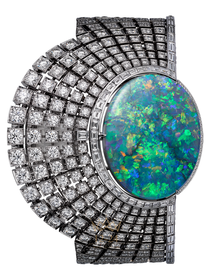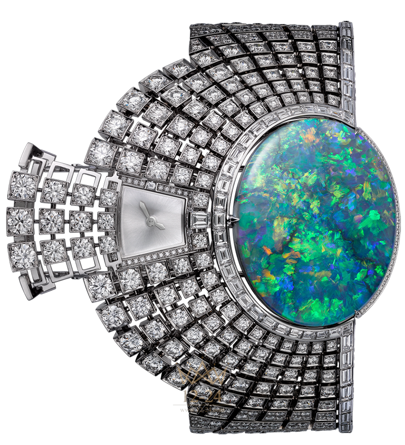 Часы со скрытым временем категории Высокое ювелирное искусство, кварцевый механизм, корпус и браслет из белого золота 18 карат с родиевым покрытием, опал овальной огранки весом 51,13 карата, 827 бриллиантов классической огранки общим весом 22,49 карата, 51 бриллиант багетной огранки общим весом 3,71 карата, посеребренный циферблат с узором “солнечные лучи” и покрытием из прозрачного лака, метка “12 часов” из бриллианта квадратной огранки, стрелки в форме мечей из желтого золота 18 карат с родиевым покрытием, водонепроницаемость до 3 бар (30 метров), единственный экземпляр.