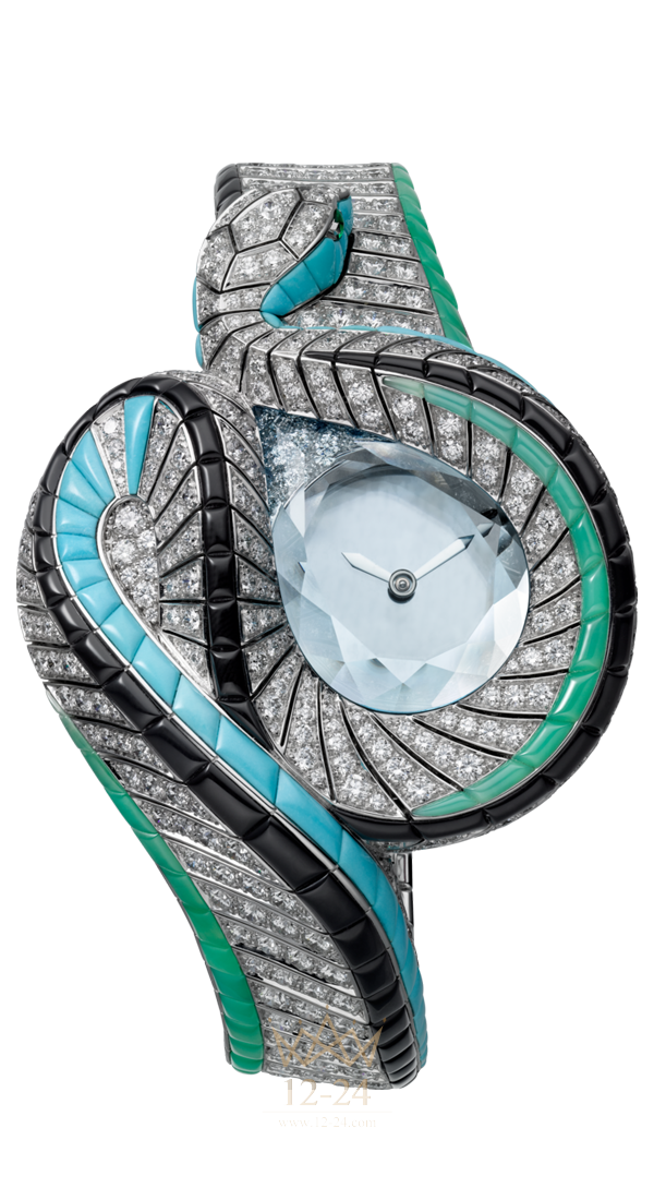 Часы Serpent Mystérieux (HPI00991) категории Высокое ювелирное искусство, механизм с ручным заводом, «загадочная» индикация часов и минут, калибр 9981 MC, корпус и браслет из белого золота 18 карат с родиевым покрытием.