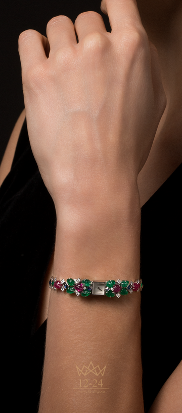 Часы с видимым временем Tiny Tutti Frutti (HPI01046) категории Высокое ювелирное искусство, механизм с ручным подзаводом, калибр 101, корпус и браслет из белого золота 18 карат с родиевым покрытием, 93 бриллианта классической огранки общим весом 1,28 карата, 8 резных изумрудов в форме листьев общим весом 2,94 карата, 4 резных рубина в форме листьев общим весом 2,75 карата, 7 сапфиров огранки suiffé общим весом 0,57 карата, 2 изумруда огранки suiffé общим весом 0,12 карата.