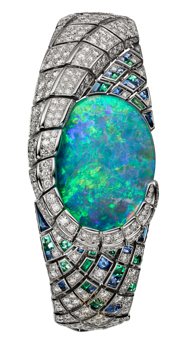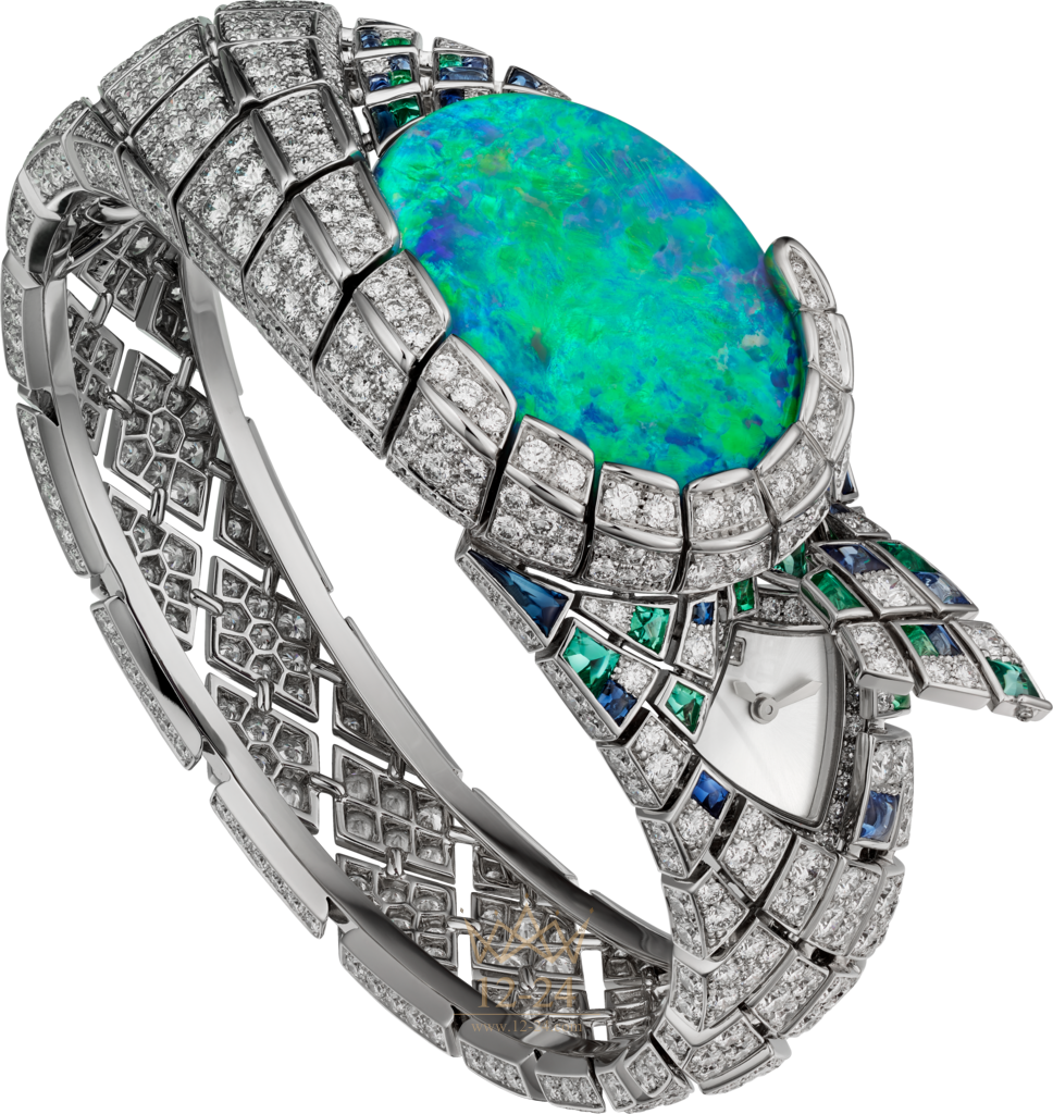 Часы категории Высокое ювелирное искусство со скрытым временем Aqualis (HPI01108), кварцевый механизм, корпус и браслет из белого золота 18 карат с родиевым покрытием, темный овальный опал в форме кабошона весом 38,25 карата, 21 сапфир багетной огранки в форме кабошона с дополнительными гранями общим весом 1,43 карата, 16 изумрудов багетной огранки в форме кабошона с дополнительными гранями общим весом 0,72 карата, 663 бриллианта классической огранки общим весом 14,03 карата.