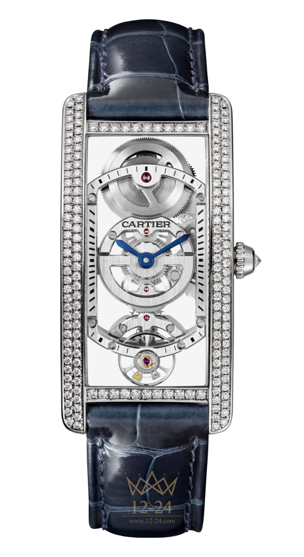 Часы Tank Cintrée (HPI01123) скелетон, механизм с ручным подзаводом, калибр 9917 MC. Корпус из платины, 168 бриллиантов классической огранки общим весом 0,9 карата, заводная головка с зернистой отделкой и бриллиантом классической огранки весом 0,1 карата, стрелки в форме мечей из вороненой стали. Ремешок из кожи аллигатора черного цвета, двойная регулируемая раскладывающаяся застежка из белого золота 18 карат, 41 бриллиант классической огранки общим весом 0,4 карата. Индикация часов и минут.