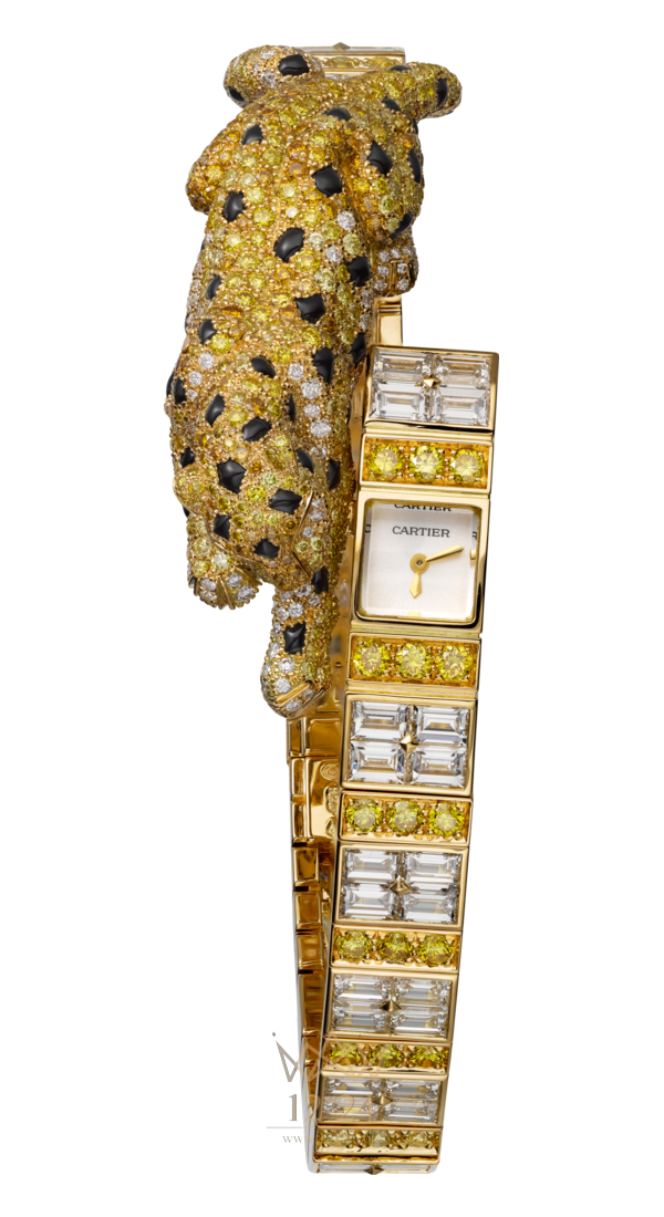 Часы с видимым временем Panthère Asymétrique (HPI01135) категории Высокое ювелирное искусство, механизм с ручным подзаводом, калибр 101, корпус и браслет из желтого золота 18 карат украшены 64 бриллиантами багетной огранки общим весом 8,1 карата, 397 желтых бриллиантов общим весом 3,22 карата, 186 оранжевых бриллиантов классической огранки общим весом 0,83 карата и 315 бриллиантов классической огранки общим весом 1,78 карата, 2 изумруда (глаза), оникс (пятна и нос).