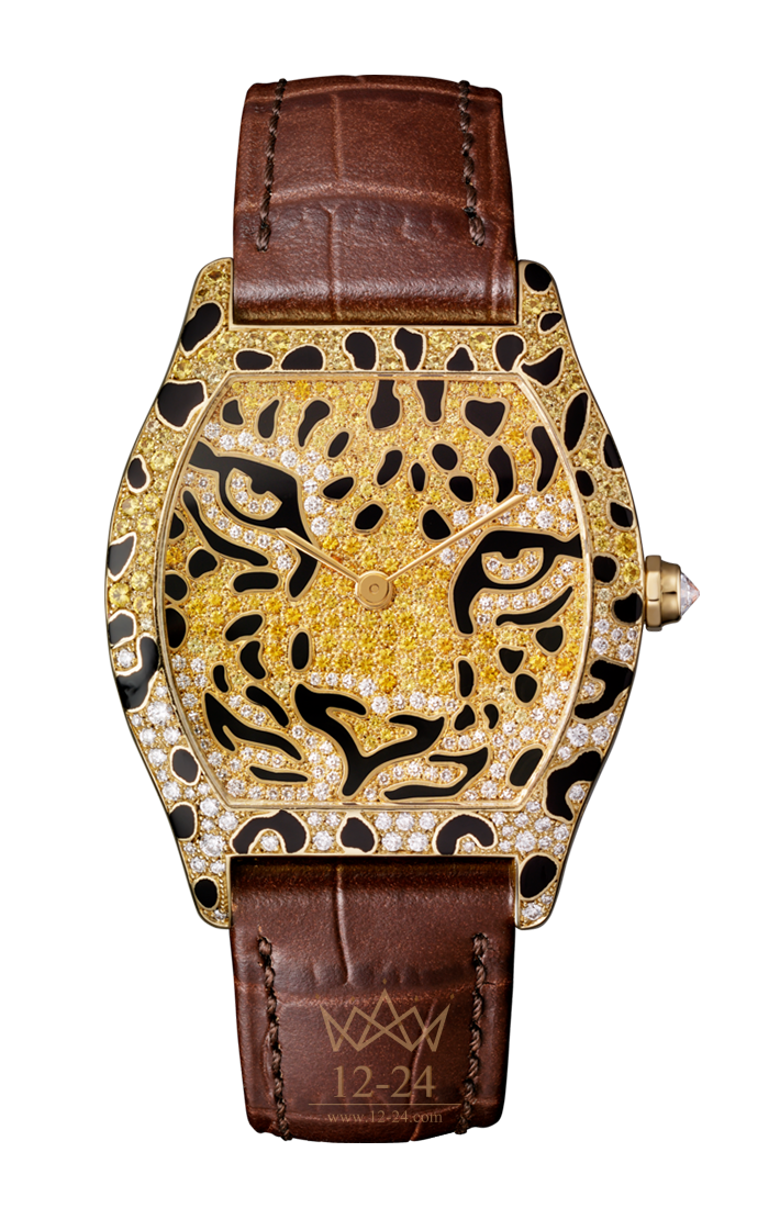 Часы Tortue Regard de Panthère (HPI01190), модель среднего размера, механизм с ручным подзаводом, калибр 430 MC. Корпус и циферблат из желтого золота 18 карат, 168 бриллиантов классической огранки общим весом 0,51 карата и 226 желтых сапфиров общим весом 0,72 карата, черная эмаль (пятна), заводная головка с бриллиантом классической огранки, стрелки в форме мечей из стали с отделкой золотом, ремешок из полуматовой кожи аллигатора коричневого цвета (второй из блестящей кожи аллигатора черного цвета), стандартная застежка из желтого золота 18 карат с 21 бриллиантом классической огранки общим весом 0,2 карата. Водонепроницаемость до 3 бар (~30 метров). Ограниченная серия из 30 индивидуально пронумерованных экземпляров.