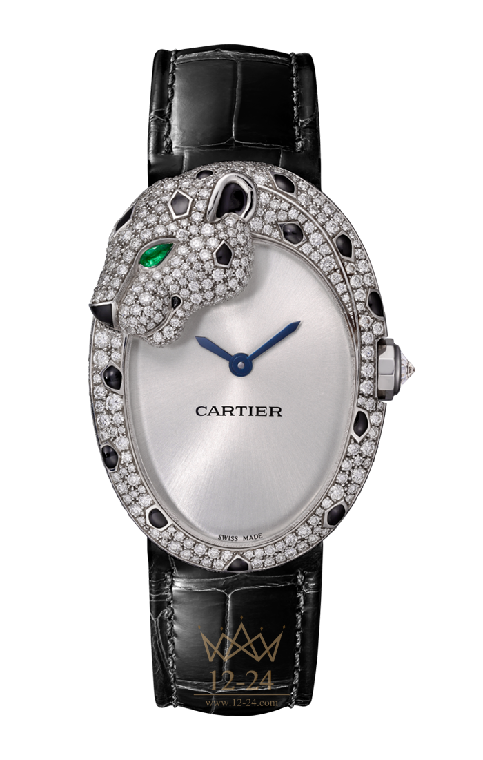 Часы Panthère Lovée (HPI01195), механизм с автоматическим подзаводом, калибр 530 MC. Корпус из белого золота 18 карат с родиевым покрытием, 390 бриллиантов классической огранки общим весом 1,71 карата, черный лак (пятна), изумруды огранки «груша» (глаз), посеребренный циферблат с эффектом «солнечные лучи», заводная головка с бриллиантом классической огранки весом 0,19 карата, стрелки в форме мечей из вороненой стали, ремешок из блестящей кожи аллигатора черного цвета (второй из блестящей кожи аллигатора темно-зеленого цвета), раскладывающаяся застежка из белого золота 18 карат с родиевым покрытием, 21 бриллиант классической огранки общим весом 0,2 карата. Водонепроницаемость до 3 бар (~30 метров).