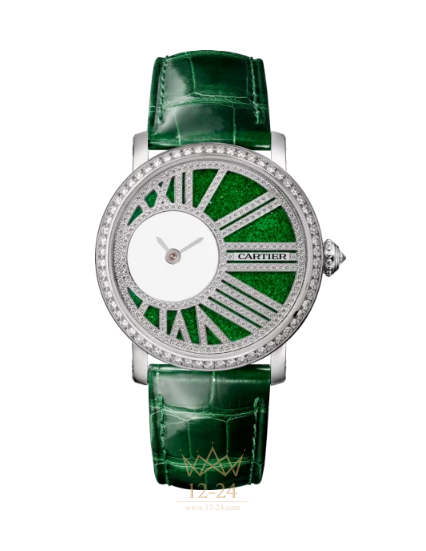 Часы Rotonde de Cartier Mysterious Hour, 35 мм, мануфактурный механизм с ручным заводом, калибр 9984 MC. Корпус из 18-каратного белого золота с родиевым покрытием, безель с 62 бриллиантами круглой огранки общим весом 0,71 карата, стеклянный циферблат из авантюрина зеленого цвета, римские цифры из 18-каратного белого золота с родиевым покрытием, набор из 282 бриллиантов общим весом 0,55 карата, с бусиной, украшенной бриллиантами общим весом 0,12 карата, родиевые стальные мечевидные руки. Ремешок из блестящей зеленой кожи аллигатора (поставляется с дополнительным блестящим черным ремешком из кожи аллигатора), с двойной регулируемой складной пряжкой из 18-каратного белого золота с родиевым покрытием, 41 бриллиантом общим весом 0,40 карата.