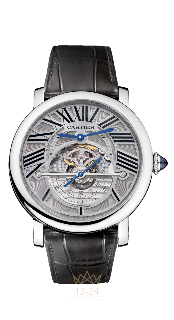 Часы Rotonde de Cartier Astrorégulateur (W1556211), 50 мм, механизм с автоматическим подзаводом, калибр 9800 MC. Корпус из ниобий-титанового сплава, заводная головка из титана с зернистой отделкой и сапфиром в форме кабошона, гальванизированный гильошированный циферблат грифельного цвета, посеребренная ажурная решетка с узором «солнечные лучи», декалькированные черные римские цифры, стрелки в форме мечей из вороненой стали.