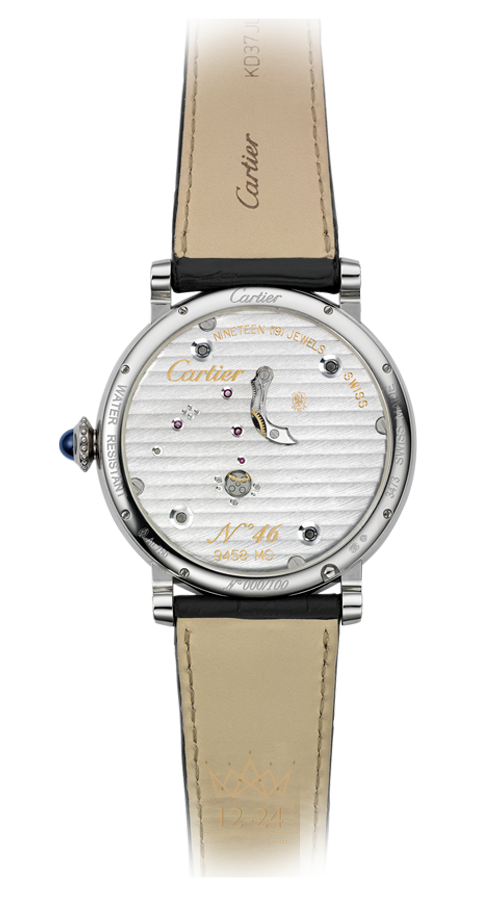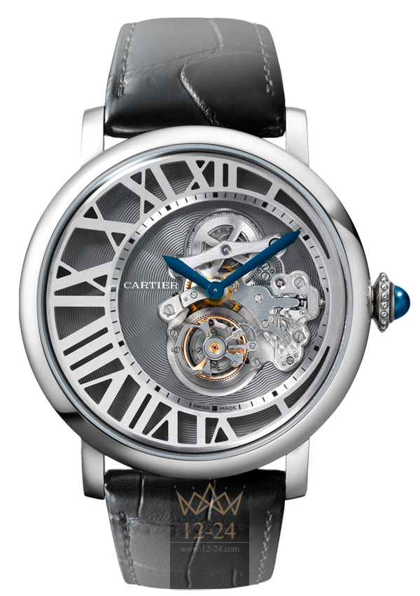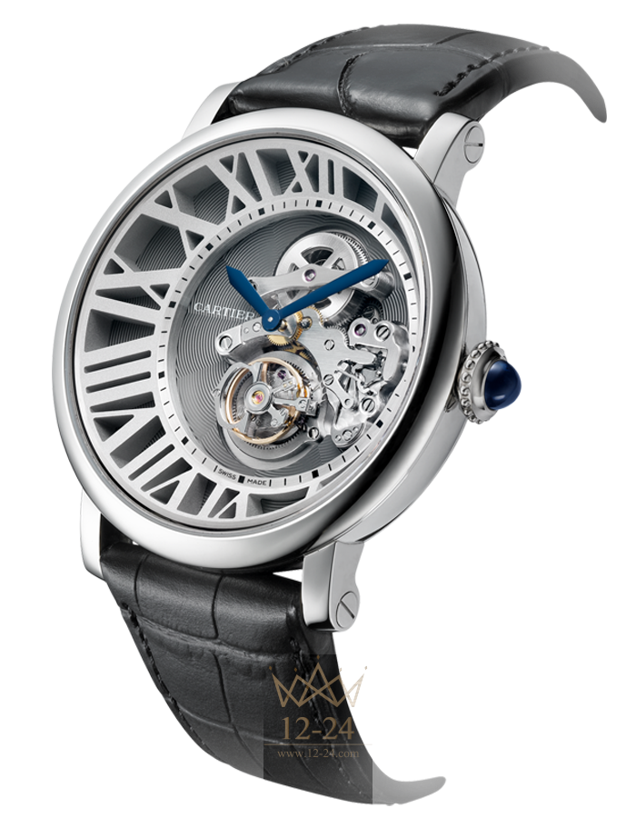 Часы Rotonde de Cartier с дугообразным циферблатом и турбийоном сочетают высокое качество традиционного часового механизма с современным графически-четким дизайном, символизируя уникальный характер новаторских часовых изделий Cartier. Они со всей тщательностью изготовлены в мастерских мануфактуры Cartier и имеют все характеристики, отличающие часы с богатым художественным наследием, представленные в современной интерпретации. Основой механизма послужил калибр 9452 MC, который пришлось полностью переработать, перевернув и частично выполнив в технике “скелетон”. Уникальная филигранная отделка выполнена в безукоризненном соответствии с традициями женевского часового искусства и удостоена престижного женевского клейма. Использование авангардных технологий при разработке модели позволяет придать своеобразную выразительную форму массивной золотой решетке часов. Затем наступает черед художественного оформления: римские цифры решетки прорезаются непосредственно в массивной золотой заготовке, вес которой в 3 раза превышает вес готового изделия. После этого в течение долгих часов выполняется скашивание кромок и другие виды ручной отделки.