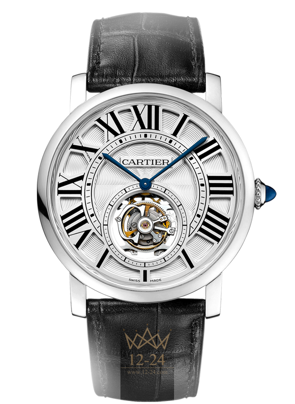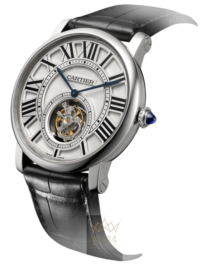 Часы Rotonde de Cartier с парящим турбийоном, 40 мм, механизм с ручным заводом, калибр 9452 MC, отмечен “Poinçon de Genève”. Корпус из белого золота 18 карат, заводная головка с зернистой отделкой украшена сапфиром в форме кабошона, серебристый гальванизированный гильошированный циферблат, посеребренная матовая ажурная решетка с узором “солнечные лучи”, декалькированные черные римские цифры, стрелки в форме мечей из вороненой стали. Ремешок из кожи аллигатора черного цвета, двойная регулируемая раскладывающаяся застежка из белого золота 18 карат. Парящий турбийон, индикация секунд при помощи каретки турбийона в форме буквы С. Индивидуально пронумерованный механизм, 142 детали, 19 камней. Диаметр механизма: 24,90 мм, высота механизма: 4,50 мм, частота баланса: 21 600 полу-колебаний/час, запас хода: около 50 часов. Задняя крышка из сапфирового стекла. Высота корпуса: 10,6 мм. Водонепроницаемость до 3 бар (30 метров).