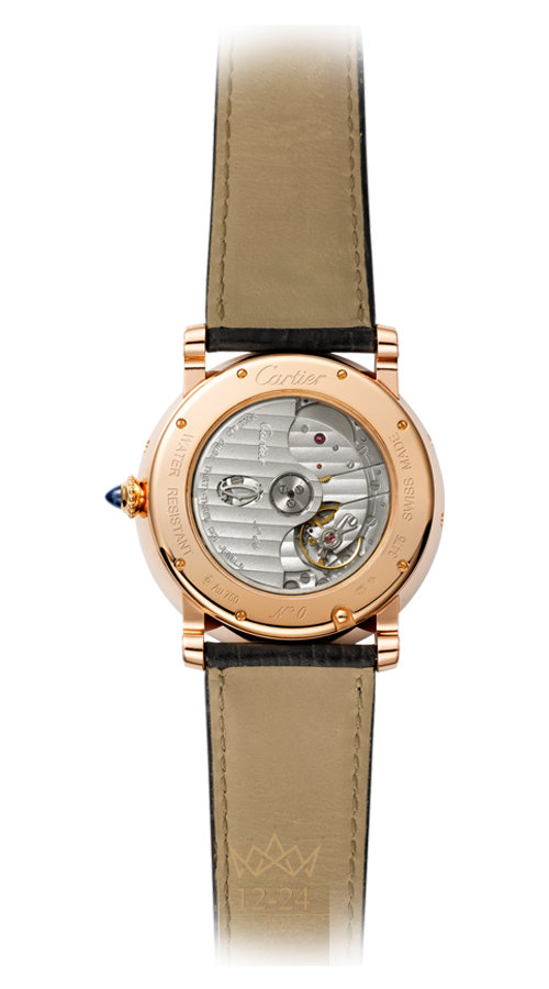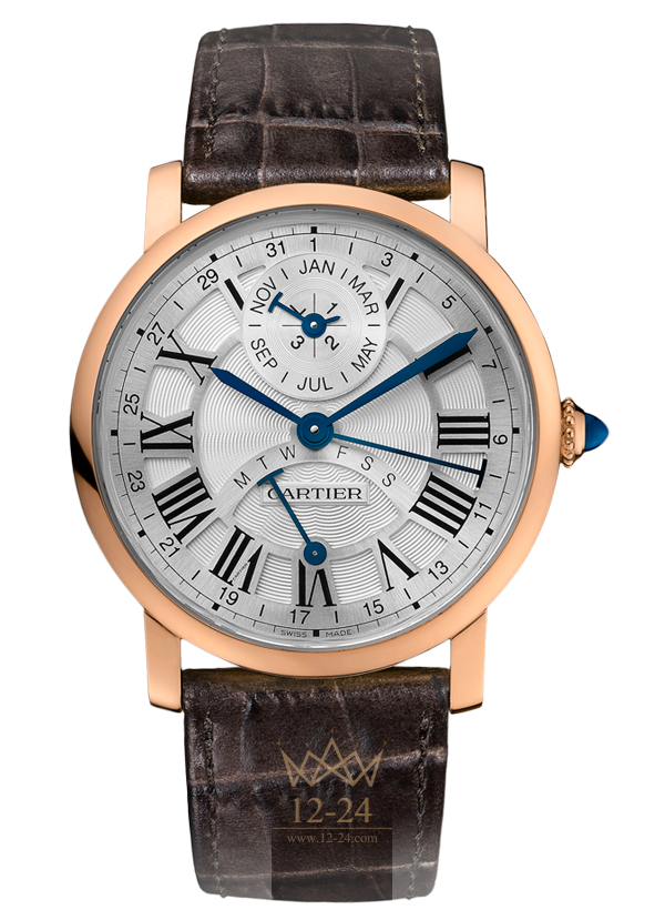 Часы Rotonde de Cartier с вечным календарем, 40,5 мм, механизм с автоматическим подзаводом, калибр 9422 MC. Корпус из розового золота 18 карат, заводная головка с зернистой отделкой украшена сапфиром в форме кабошона, белый гальванизированный гильошированный циферблат, посеребренная матовая ажурная решетка с узором “солнечные лучи”, декалькированные черные римские и арабские цифры, индикаторы месяца и дня недели, стрелки в форме мечей и молоточков из вороненой стали. Ремешок из кожи аллигатора коричневого цвета, двойная регулируемая раскладывающаяся застежка из розового золота 18 карат. Ретроградный стрелочный индикатор дня недели, индикатор месяца и високосного года в положении “12 часов”. Индивидуально пронумерованный механизм, 293 детали, 33 камня. Диаметр механизма: 32 мм, высота механизма: 5,88 мм, частота баланса: 28 800 полу-колебаний/час, запас хода: около 52 часов. Задняя крышка из сапфирового стекла. Высота корпуса: 13 мм. Водонепроницаемость до 3 бар (30 метров).