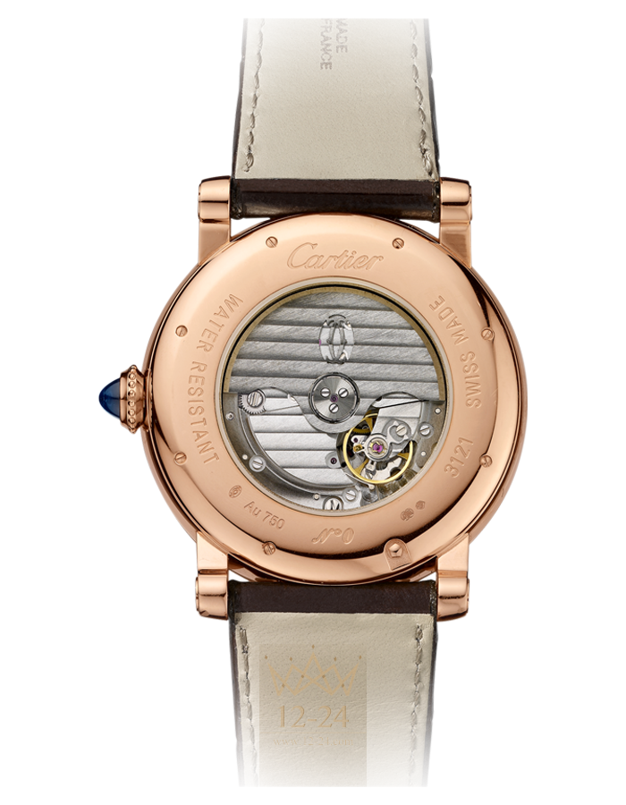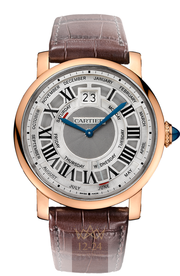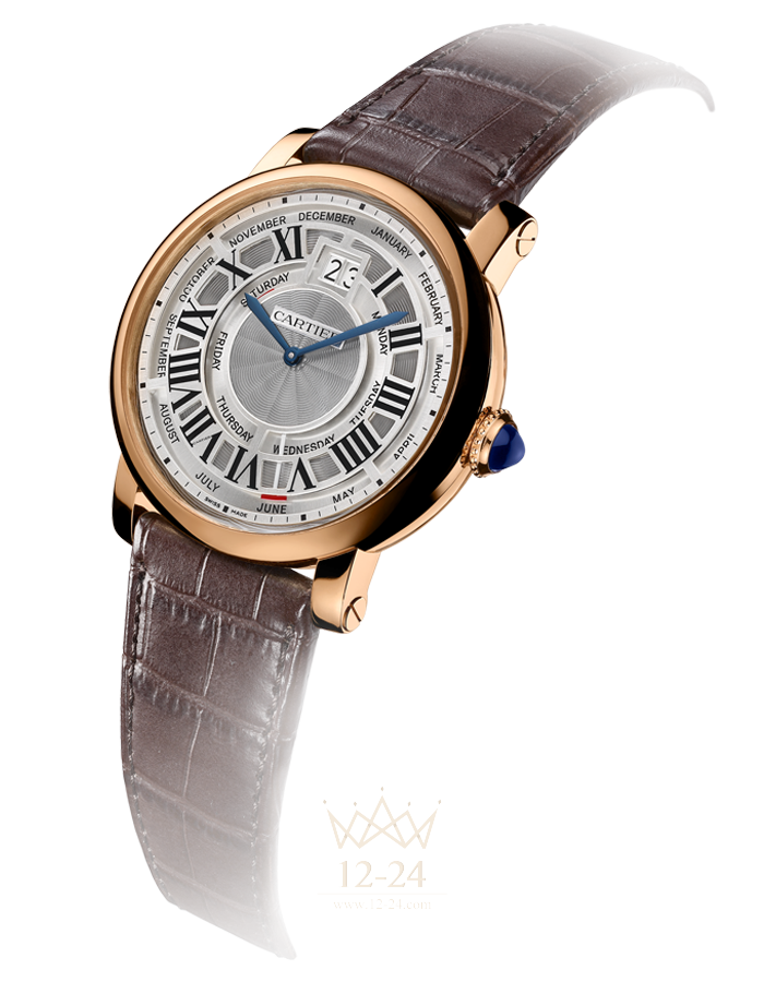 Часы Rotonde de Cartier с годовым календарем, 45 мм, механизм с автоматическим подзаводом, калибр 9908 MC. Корпус из розового золота 18 карат, заводная головка с зернистой отделкой украшена сапфиром в форме кабошона, гальванизированный гильошированный нижний циферблат грифельного цвета, посеребренный индикатор дня недели и месяца с узором “солнечные лучи”, посеребренная ажурная решетка с узором “солнечные лучи”, декалькированные черные римские цифры, гальванизированный гильошированный центр грифельного цвета, стрелки в форме мечей из вороненой стали, стрелки в форме молоточков с красными наконечниками. Ремешок из кожи аллигатора коричневого цвета, двойная регулируемая раскладывающаяся застежка из розового золота 18 карат. Стрелочные индикаторы дня недели и месяца, большое окошко даты в положении “12 часов”. Индивидуально пронумерованный механизм, 239 деталей, 32 камня. Диаметр механизма: 30 мм, высота механизма: 5,90 мм, частота баланса: 28 800 полуколебаний/час, запас хода: около 48 часов. Задняя крышка из сапфирового стекла. Высота корпуса: 14,05 мм. Водонепроницаемость до 3 бар (30 метров).