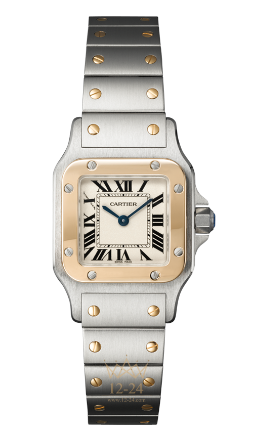 Часы Galbée, маленькая модель, кварцевый механизм, калибр Cartier 157. Корпус из стали, ободок из желтого золота 18 карат, семигранная заводная головка из стали украшена граненой синтетической шпинелью, посеребренный матовый циферблат, римские цифры, стрелки в форме мечей из вороненой стали, сапфировое стекло, браслет из стали с винтами из желтого золота 18 карат. Размеры корпуса: 34,8 мм х 26,2 мм. Высота корпуса: 6 мм. Водонепроницаемость до 30 метров.