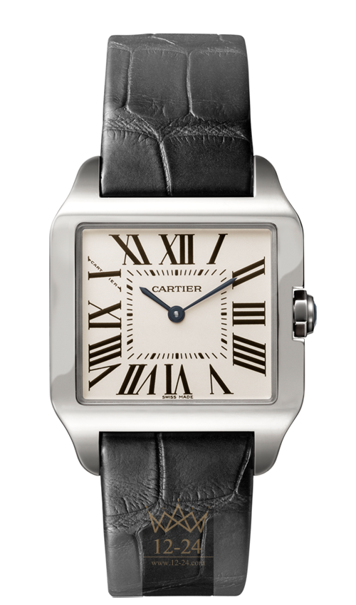 Часы Dumont, маленькая модель, кварцевый механизм, калибр Cartier 690. Корпус из белого золота 18 карат, семигранная заводная головка с граненым сапфиром, посеребренный циферблат с круговым зернением, черные стрелки в форме мечей из оксидированной стали, сапфировое стекло, ремешок из кожи аллигатора, регулируемая раскладывающаяся застежка из белого золота 18 карат. Размеры корпуса: 38,5 мм х 30,30 мм. Высота корпуса: 5,38 мм. Водонепроницаемость до 30 метров.