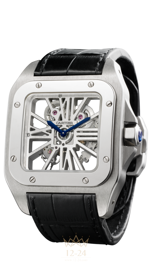 Часы Santos 100 Скелетон (W2020018), модель XL, механизм с ручным заводом, калибр 9611 MC. Корпус из палладия 950 пробы, граненая заводная головка украшена граненым сапфиром, циферблат с римскими цифрами образован мостами механизма, стрелки в форме мечей из вороненой стали.