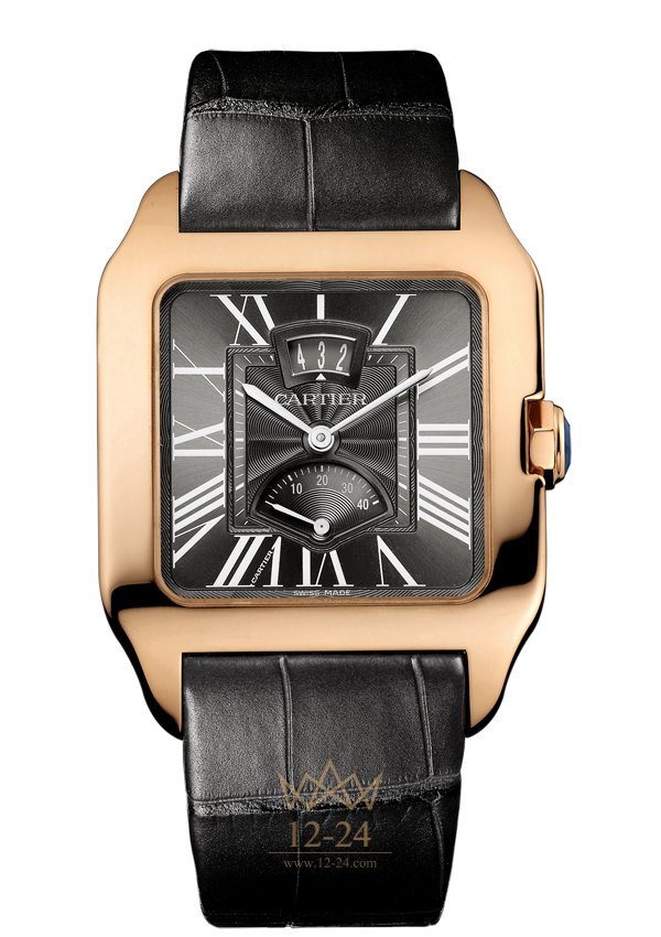 Часы Santos Dumont, механизм с ручным заводом, калибр Cartier 9750 MC, корпус из розового золота 18 карат, граненая заводная головка с граненым сапфиром, гальванизированный гильошированный в технике flinqué циферблат серого цвета, римские цифры, стрелки в форме мечей из стали с родиевым покрытием, сапфировое стекло, ремешок из полуматовой кожи аллигатора серого цвета, двойная регулируемая раскладывающаяся застежка из розового золота 18 карат, окошко календаря в положении “12 часов”, индикатор запаса хода в положении “6 часов”. Размеры корпуса: 38 мм x 47,4 мм. Высота корпуса: 9,3 мм. Водонепроницаемость до 3 бар (30 метров).